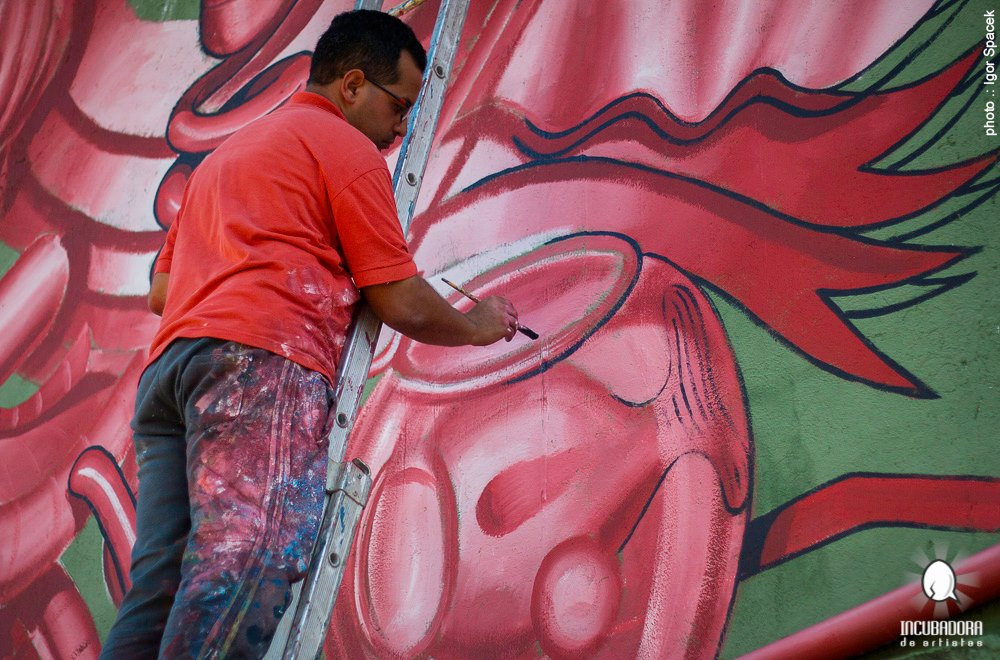 Galvani Galo "aka" Galo, nascido em São Bernardo do Campo, região metropolitana de São Paulo, começou a fazer Graffiti em junho de 2009. No início da carreira não sabia usar spray e por isso passou a utilizar pincéis em todas as suas composições, técnica que utiliza até hoje. Seu trabalho é predominantemente monocromático, com ênfase em tons de vermelho e branco, uma técnica conhecida como degradê, onde há uma transição suave entre uma cor e o branco. Seus personagens fazem parte de um universo particular e lúdico, composto por peixes robóticos, quimeras, máquinas, engrenagens, botões, telas tubulares de TV, toca-fitas, souvenirs que remontam a dispositivos eletrônicos da década de 1980. A maioria das composições é criada usando o método "free style", que consiste na criação de painéis artísticos sem esboços, as composições são inventadas à medida que o artista pinta, frequentemente interagindo com recursos na parede ou artistas que estão próximos. Galvani Galo "aka" Galo, born in São Bernardo do Campo, São Paulo metropolitan area, started doing Graffiti in June 2009. At the beginning of his career he didn't know how to use spray paint, so he started using brushes in all his compositions, a technique he still uses today. His work is predominantly monochromatic, with emphasis on red and white tones, using a gradient technique where there's a smooth transition between one color and white. His characters are part of a unique and playful universe, composed of robotic fish, chimeras, machines, gears, buttons, tubular TV screens, cassette players, and souvenirs that evoke electronic devices from the 1980s. Most compositions are created using the "free style" method, which involves creating artistic panels without sketches - compositions are invented as the artist paints, often interacting with features on the wall or nearby artists who want to collaborate.